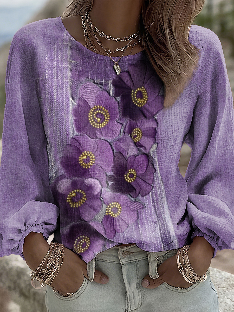 Women's Retro Floral Purple 3D Print V-Neck Long Sleeve T-Shirt