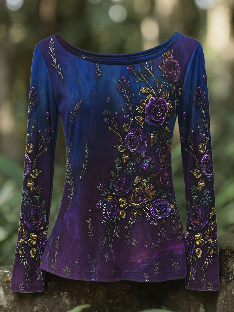 Women's Retro 3D Floral Embroidery Gradient Pattern Round Neck Long Sleeve T-shirt
