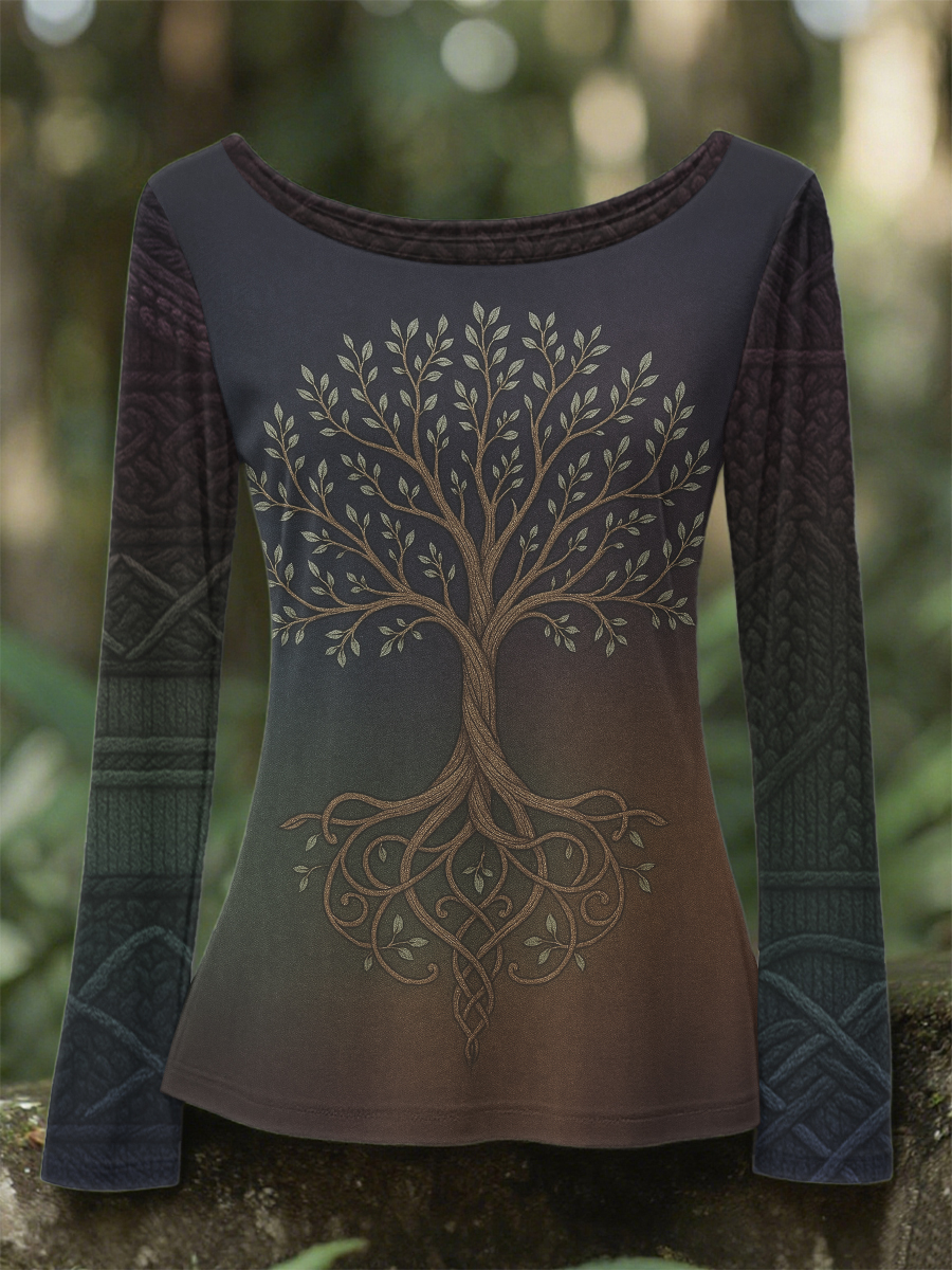 Women's Vintage Tree of Life Celtic Chunky Knit Comfortable Crew Neck Long Sleeve T-Shirt