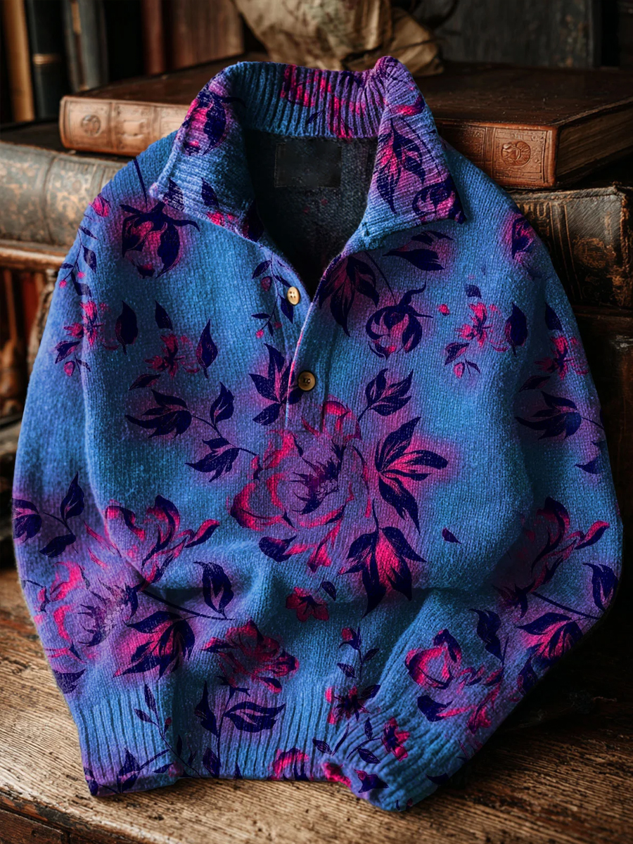 Men's Vintage Ethinic Flower Art Print Button Stand Collar Pullover Sweater