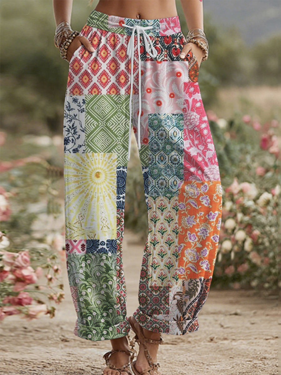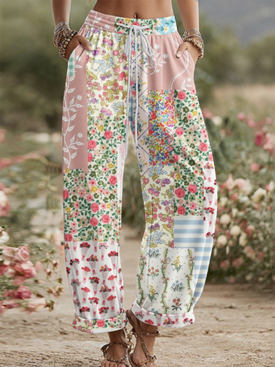 Women's Vintage Rose and Floral Patchwork Art Linen Pants