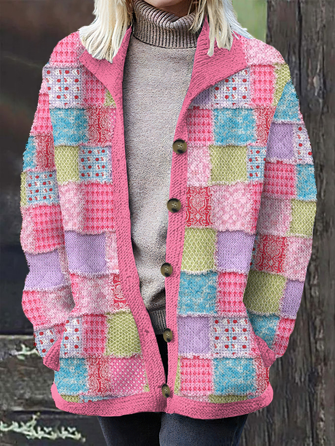 Women's Breast Cancer Pink Patchwork Print Cardigan
