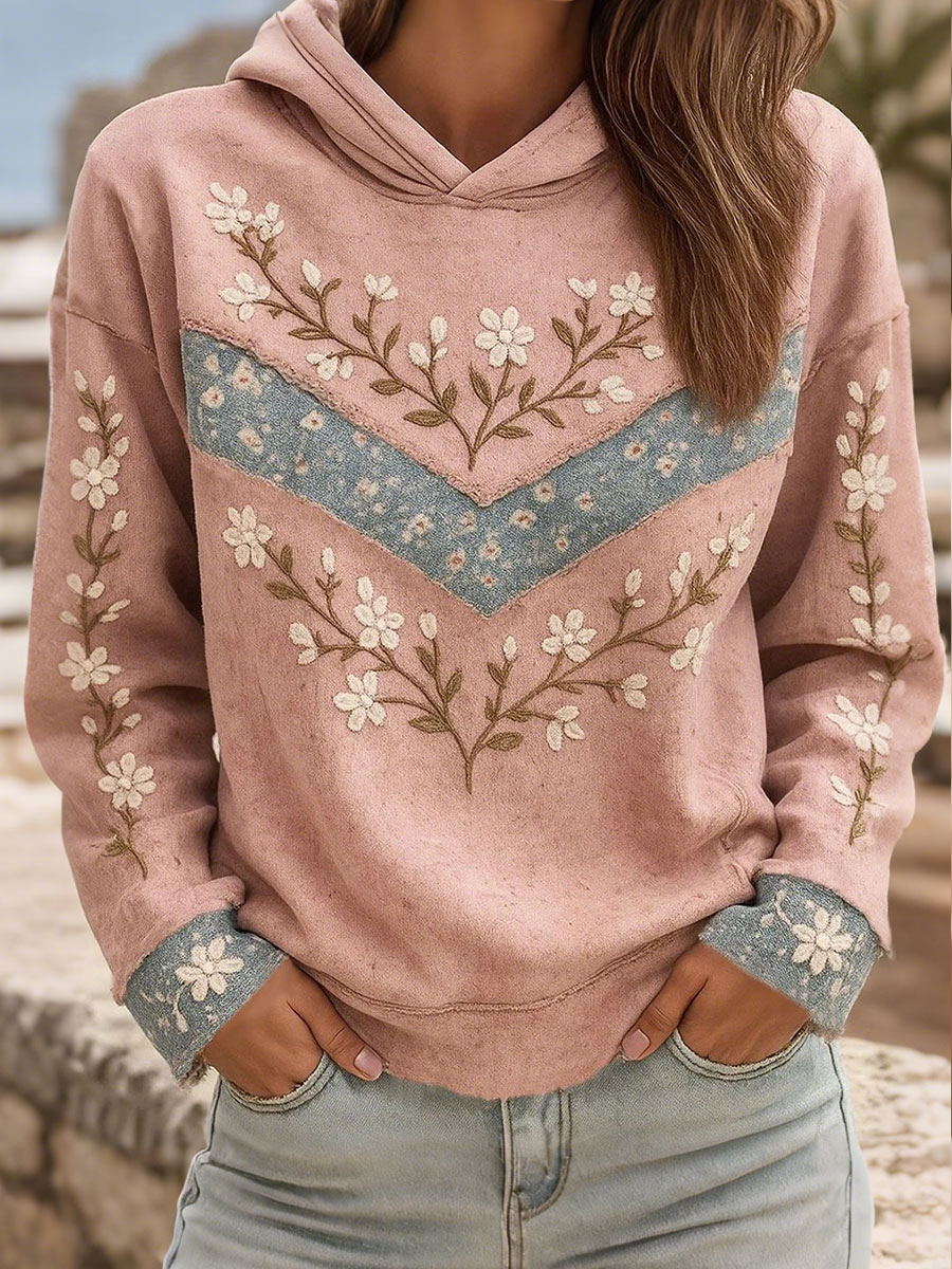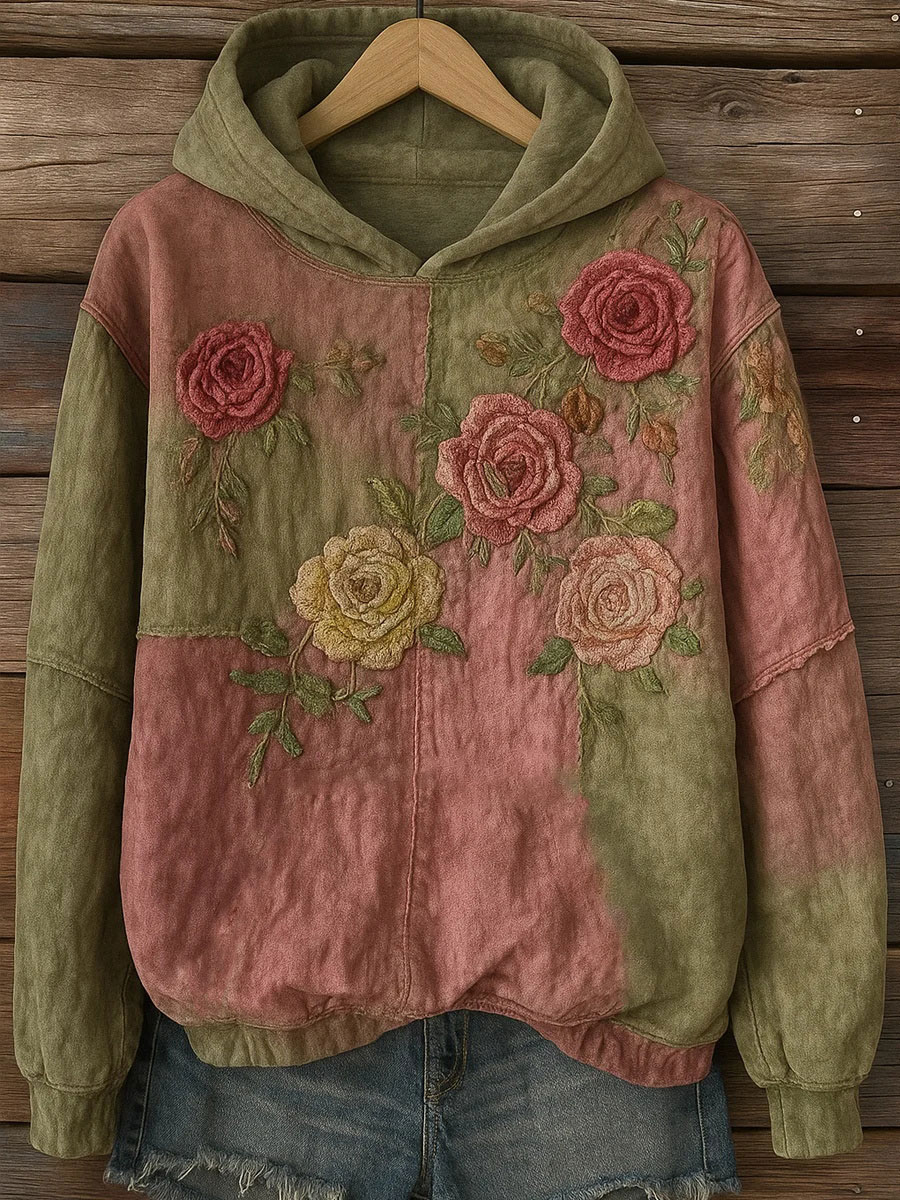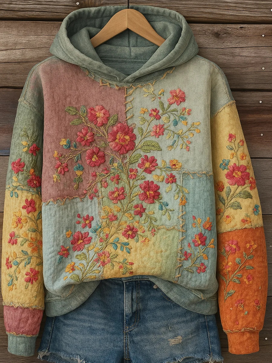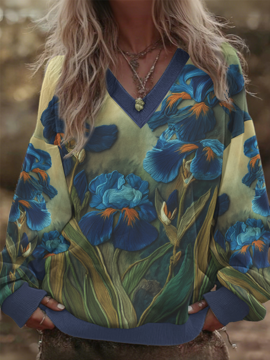 Women's V-neck Iris Floral Patchwork Oversized Sweatshirt