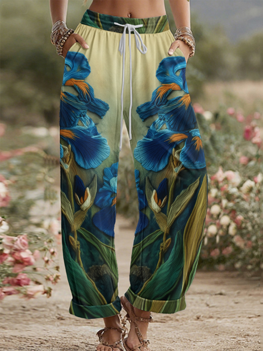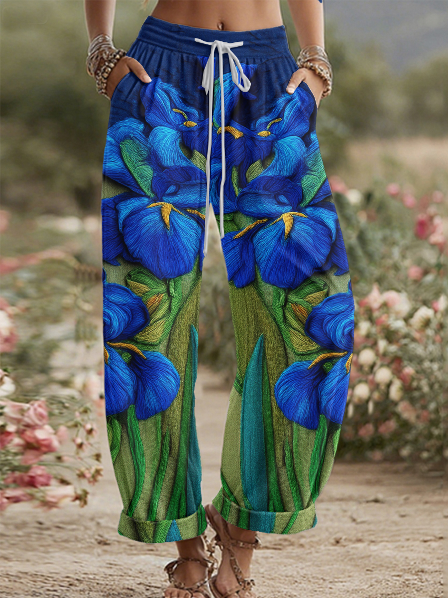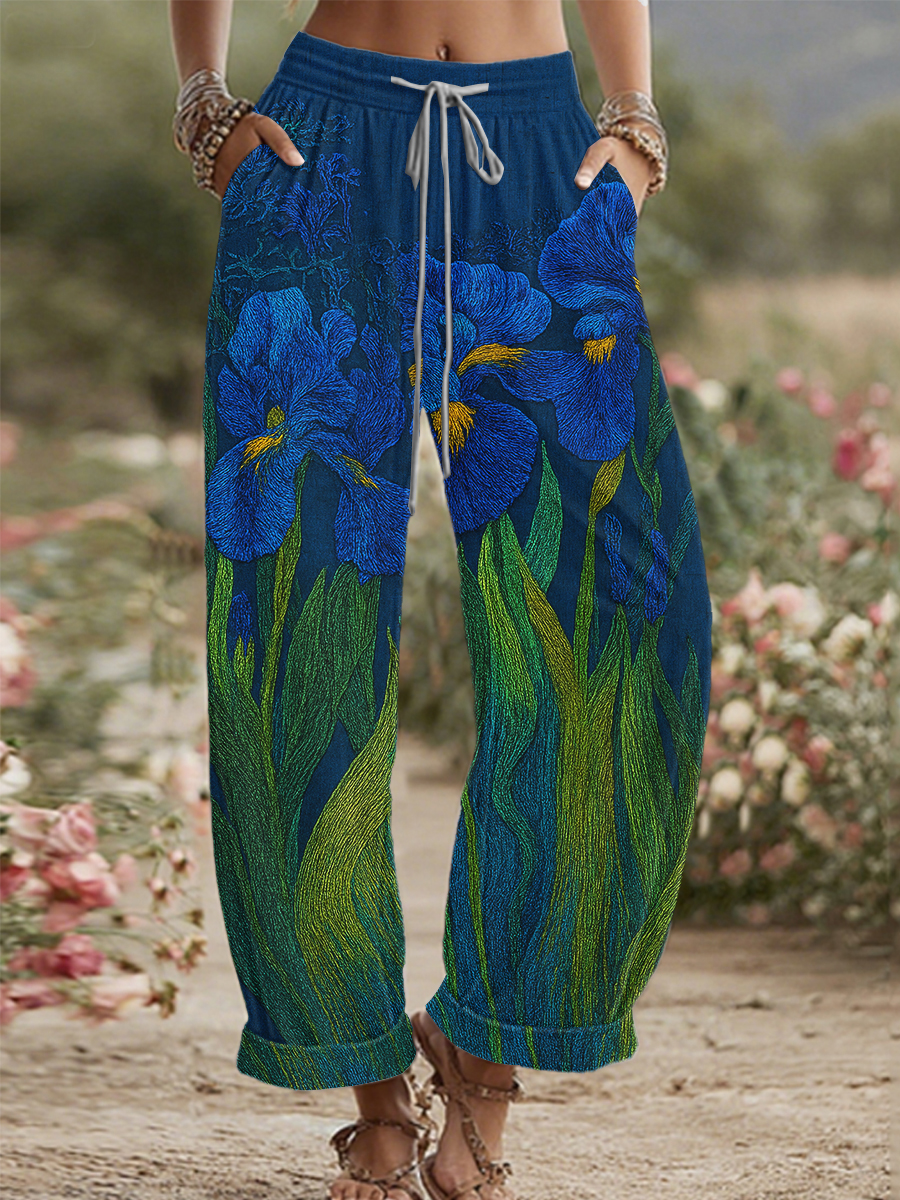 Women's Iris Embroidered Flowy Cotton and Linen Casual Pants