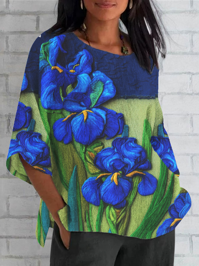 Women's Oil Painting Inspired Irises Embroidered Flowy Linen Casual Shirt