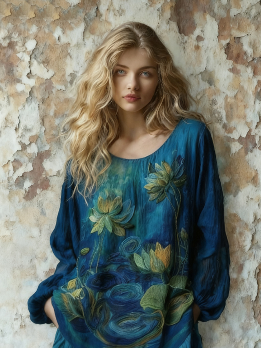 Women's Vintage Lotus Floral Landscape Art Embroidery Sleeve Shirt