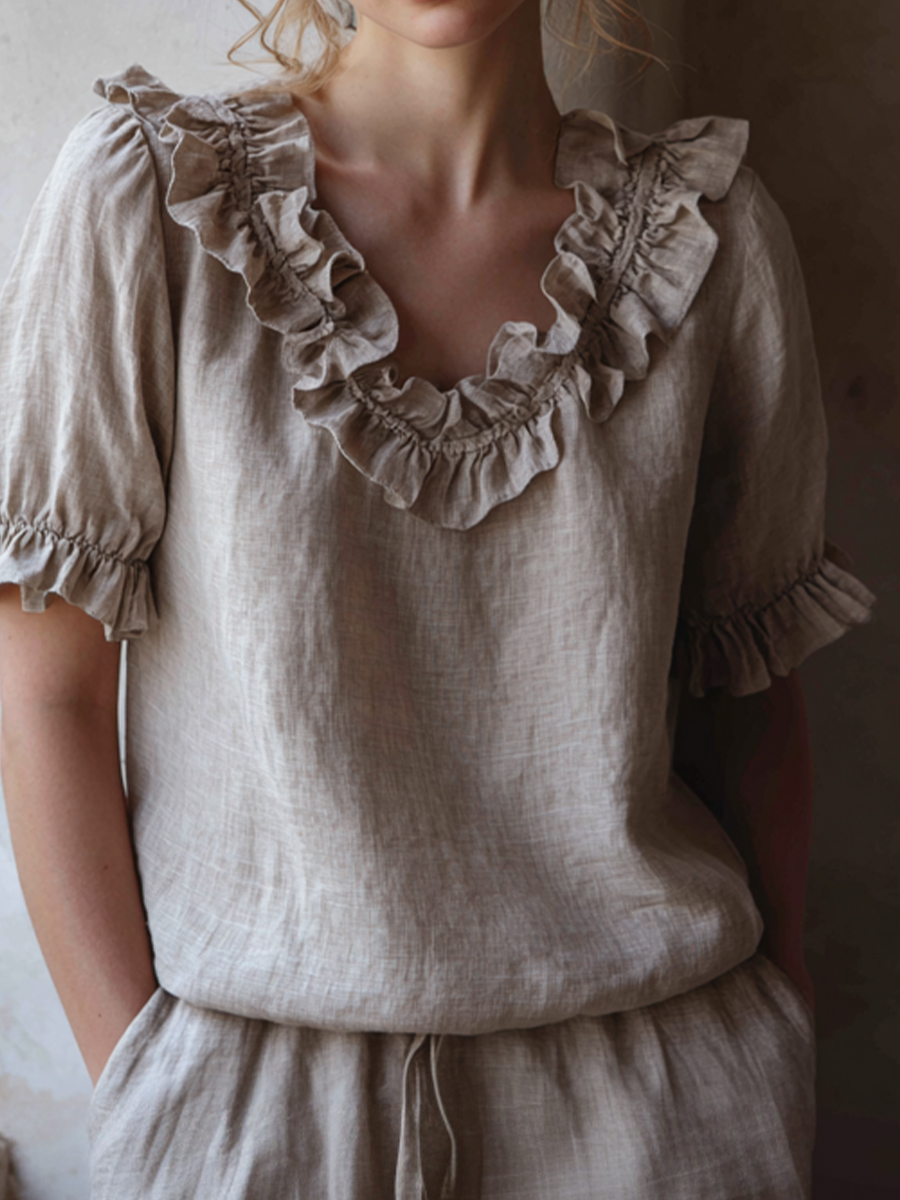 Women's Elegant Ruffled Linen V-neck Shirt