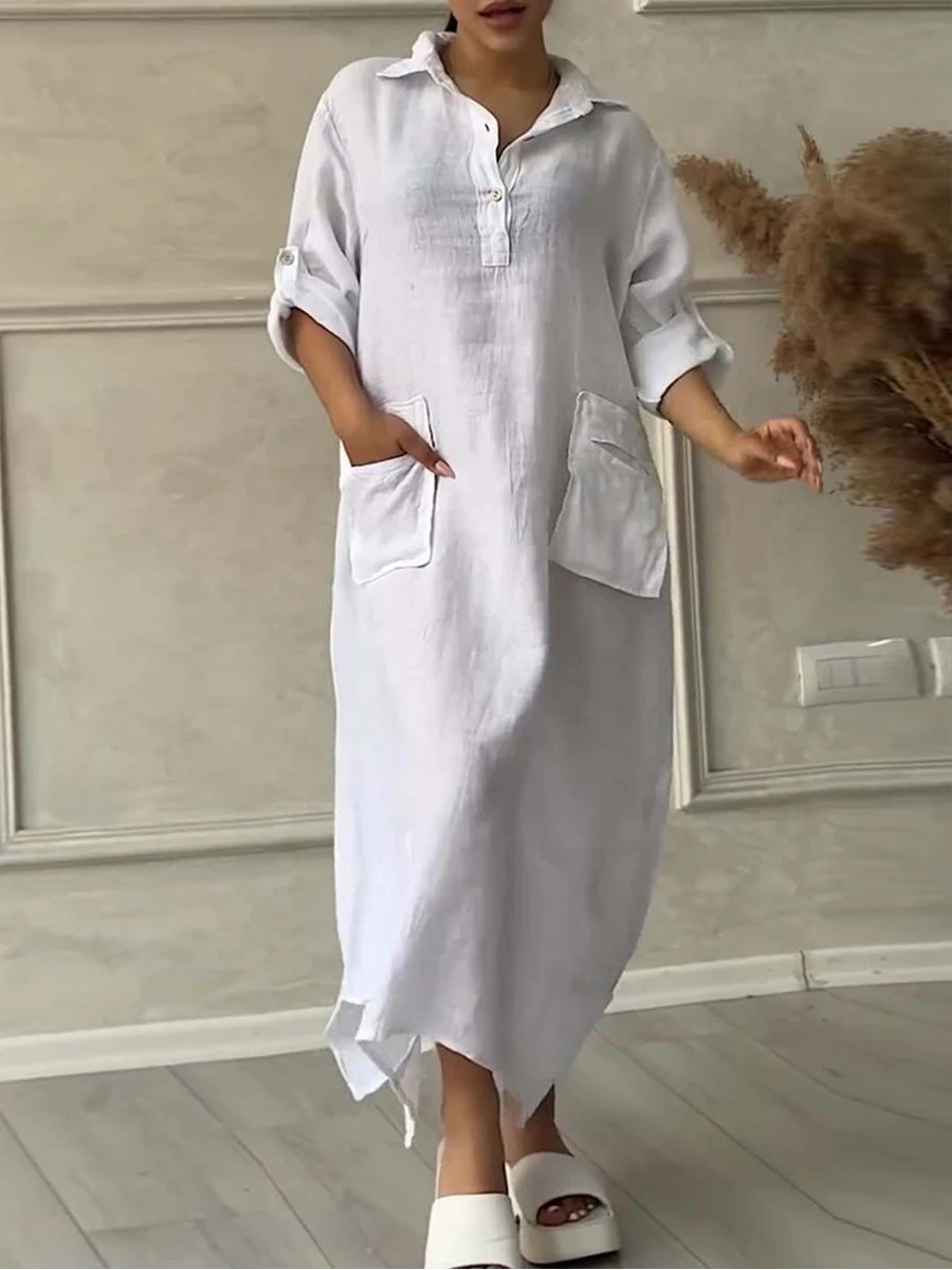 Women's Solid Color Irregular Long Cotton Linen Lapel Pocket Dress