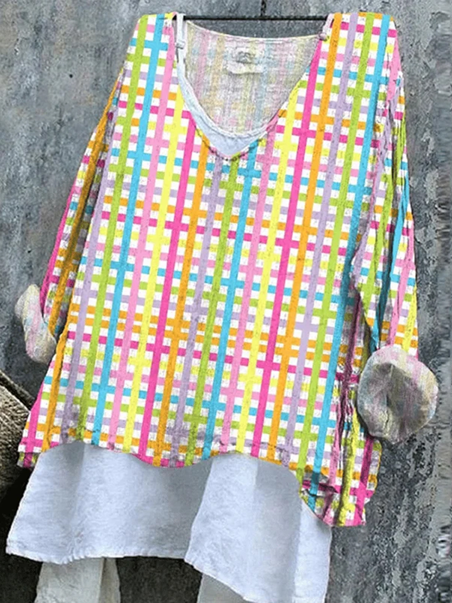 Women's Easter Vintage Colorful Plaid Print Casual Linen V Neck Long Sleeve Shirt
