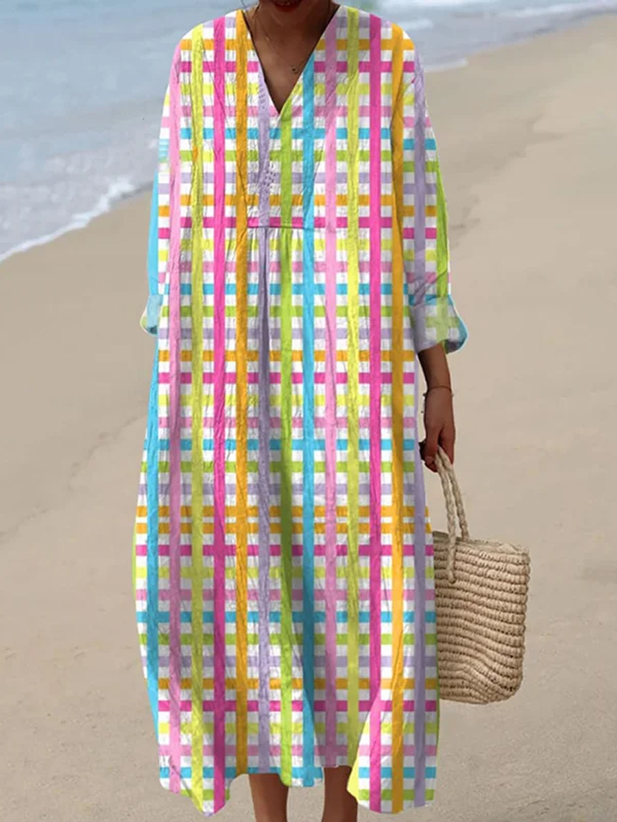 Women's Easter Vintage Colorful Plaid Print Casual Linen V Neck Dress