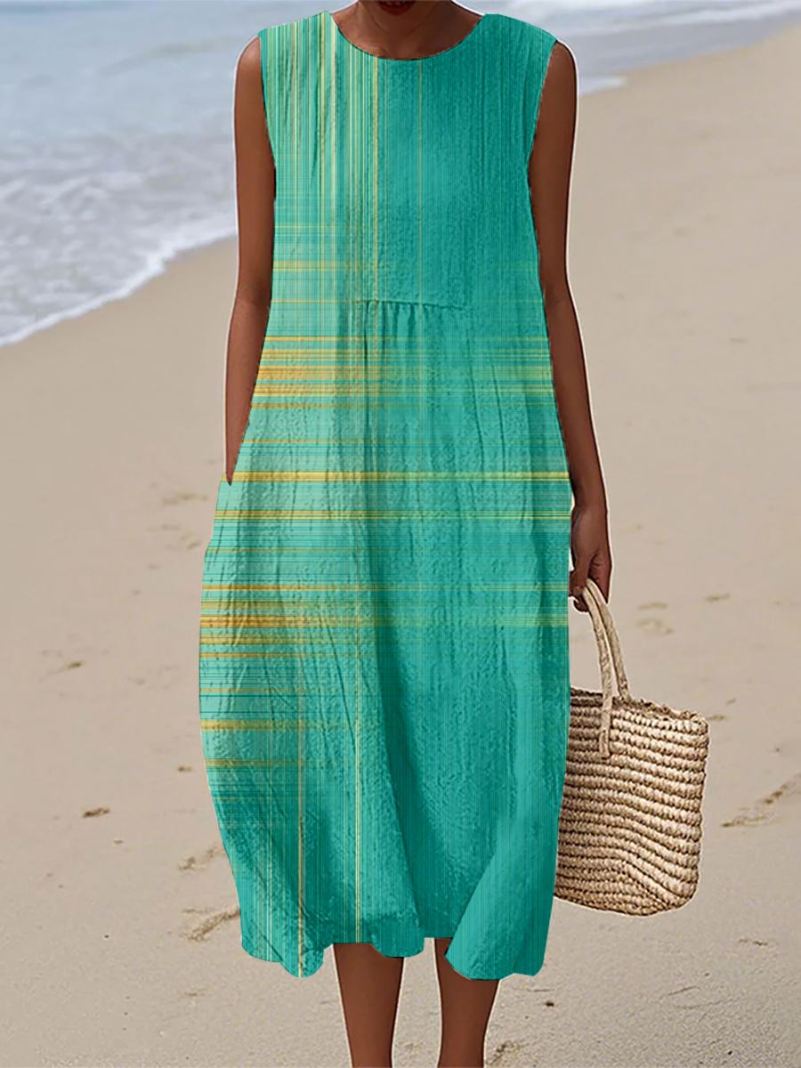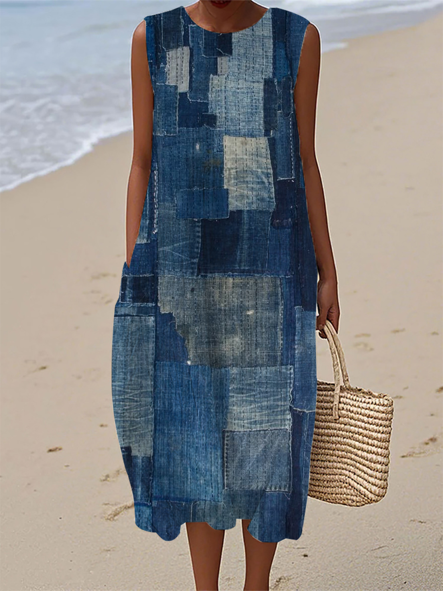 Women's Vintage Denim Patch Cotton Linen Casual Sleeveless Dress