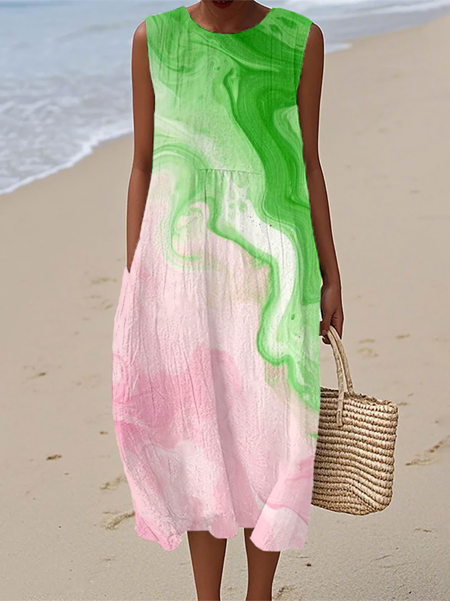 Womens Green and Pink Contrast Color Inspired Linen Dress