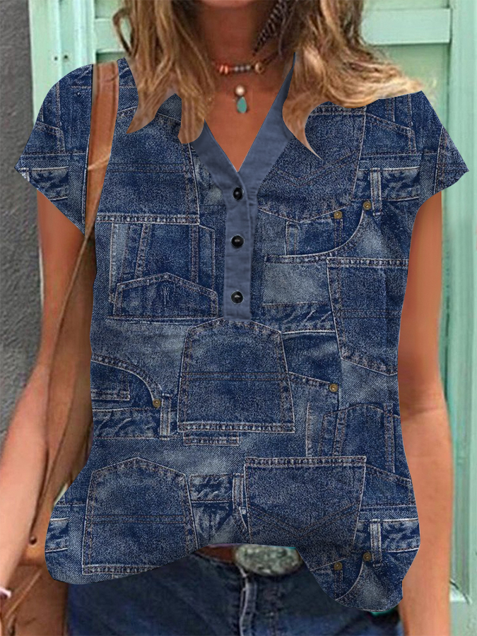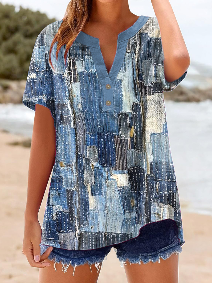 Women's Vintage Denim Patch Cotton Linen Casual Short Sleeve Shirt