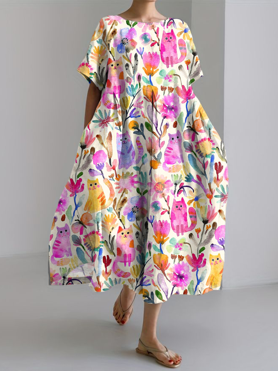 Women's Colorful Cat Art Print Linen Dress