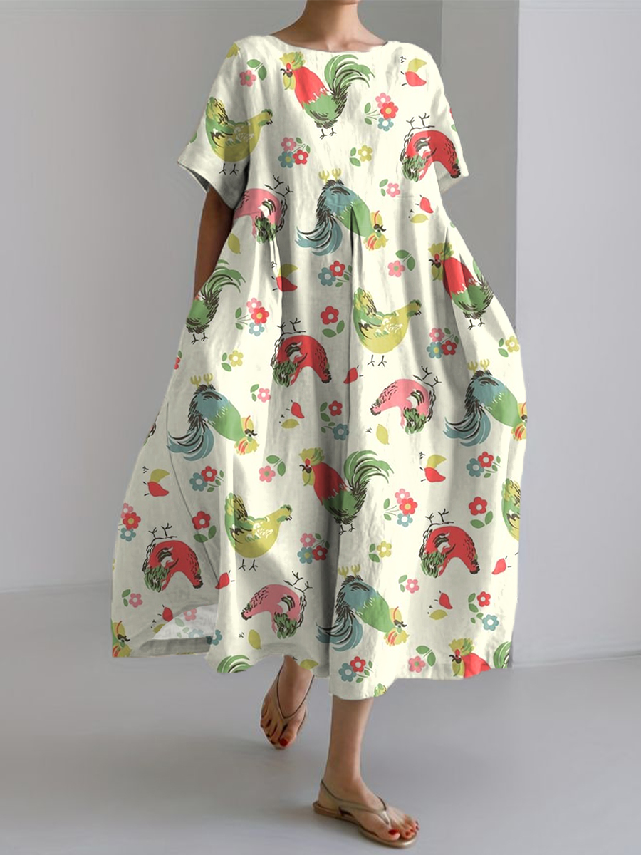 Women's Farm Chicken & Floral Print Linen Dress