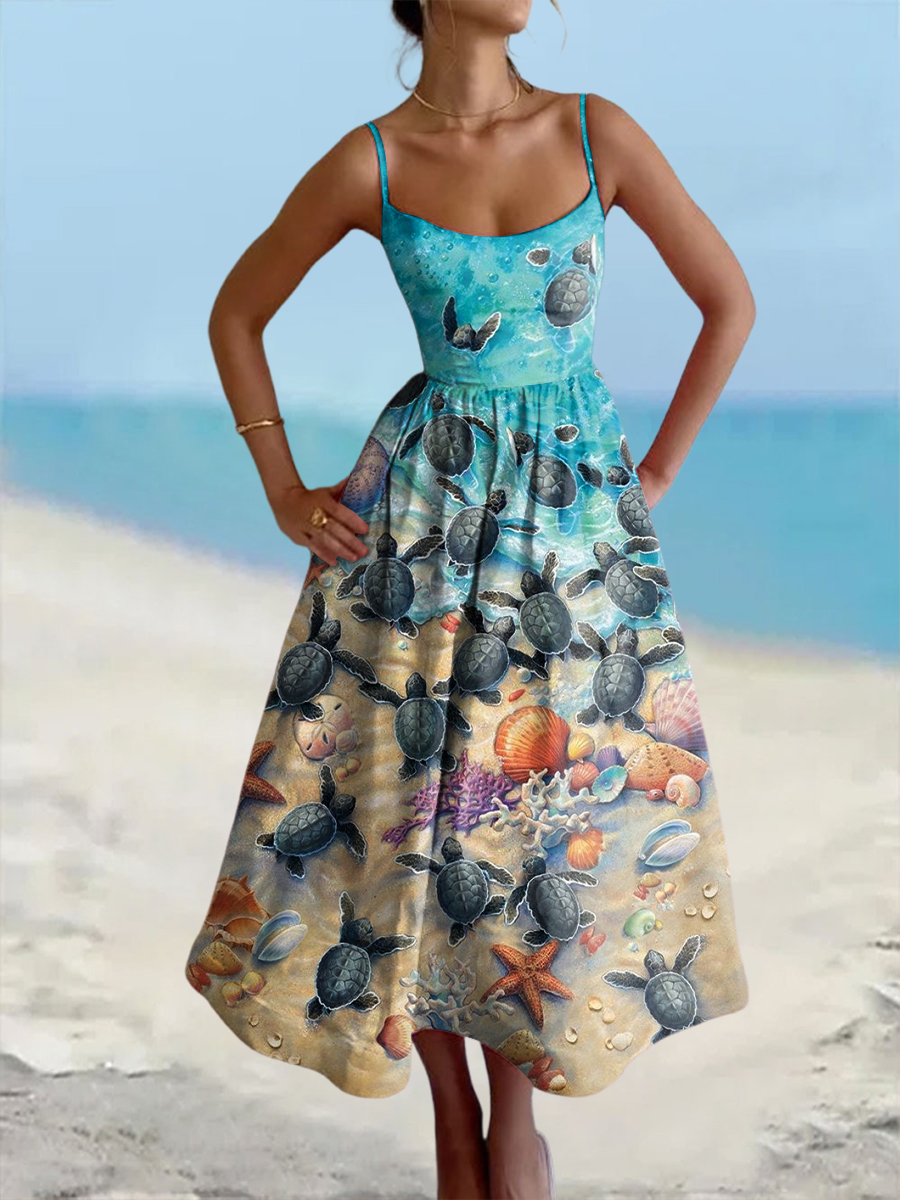 Women's Turtle Printed Printed Cotton Linen Camisole Maxi Dress