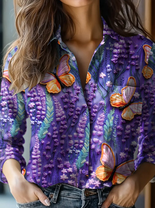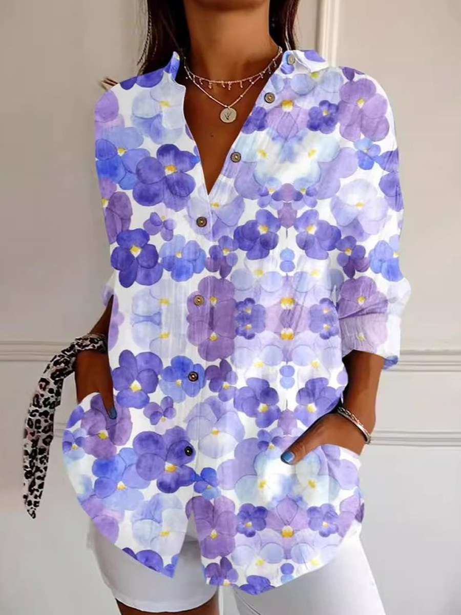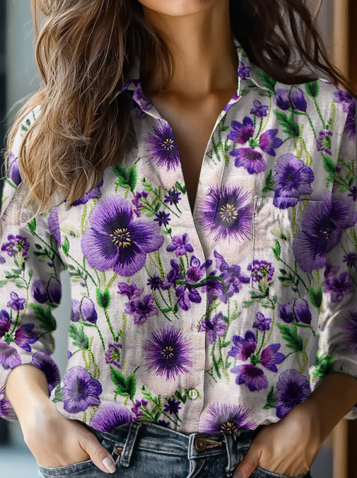 Women's Alzheimer's Awareness Purple Flower Printed Cotton Linen Long Sleeve Shirt