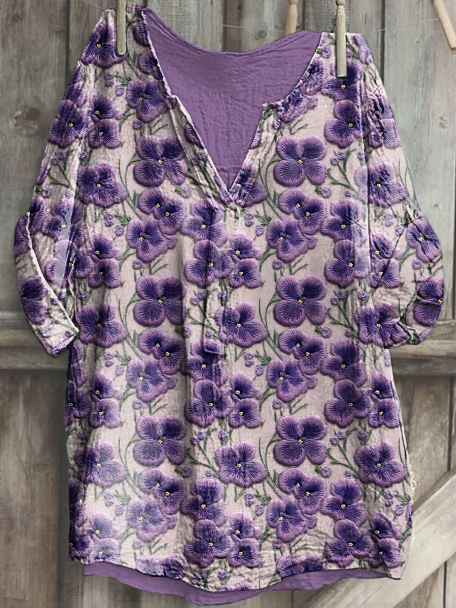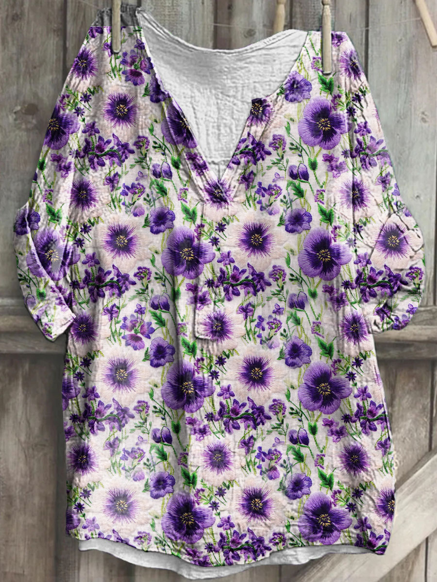 Women's Alzheimer's Awareness Purple Flower Printed V-Neck Cotton Linen Long Sleeve Shirt