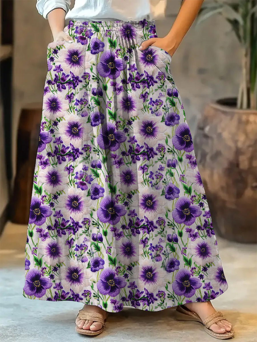 Women's Alzheimer's Awareness Purple Flower Printed Cotton Linen Skirt Dress