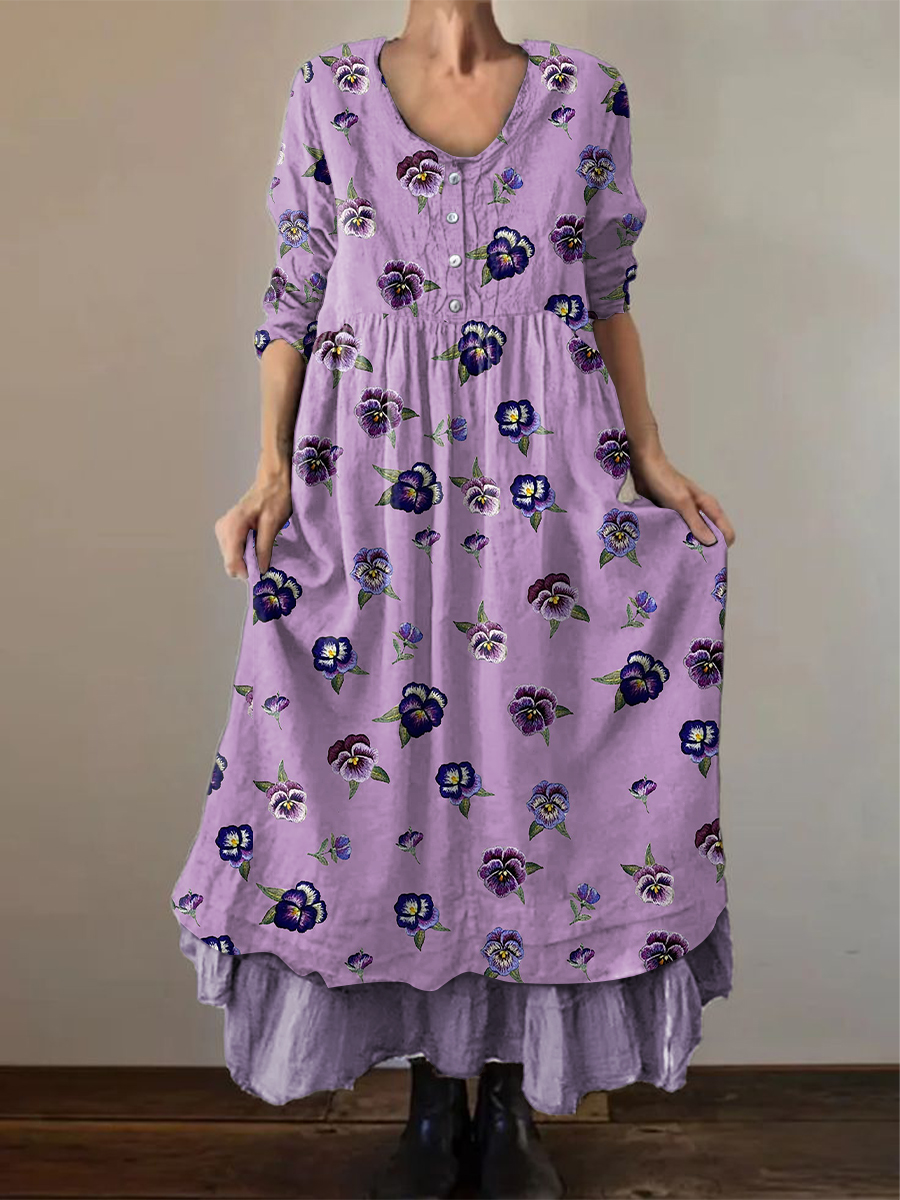 Women's Alzheimer's Awareness Purple Flower Printed Cotton Linen Long Sleeve Maxi Dress
