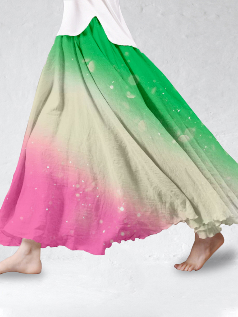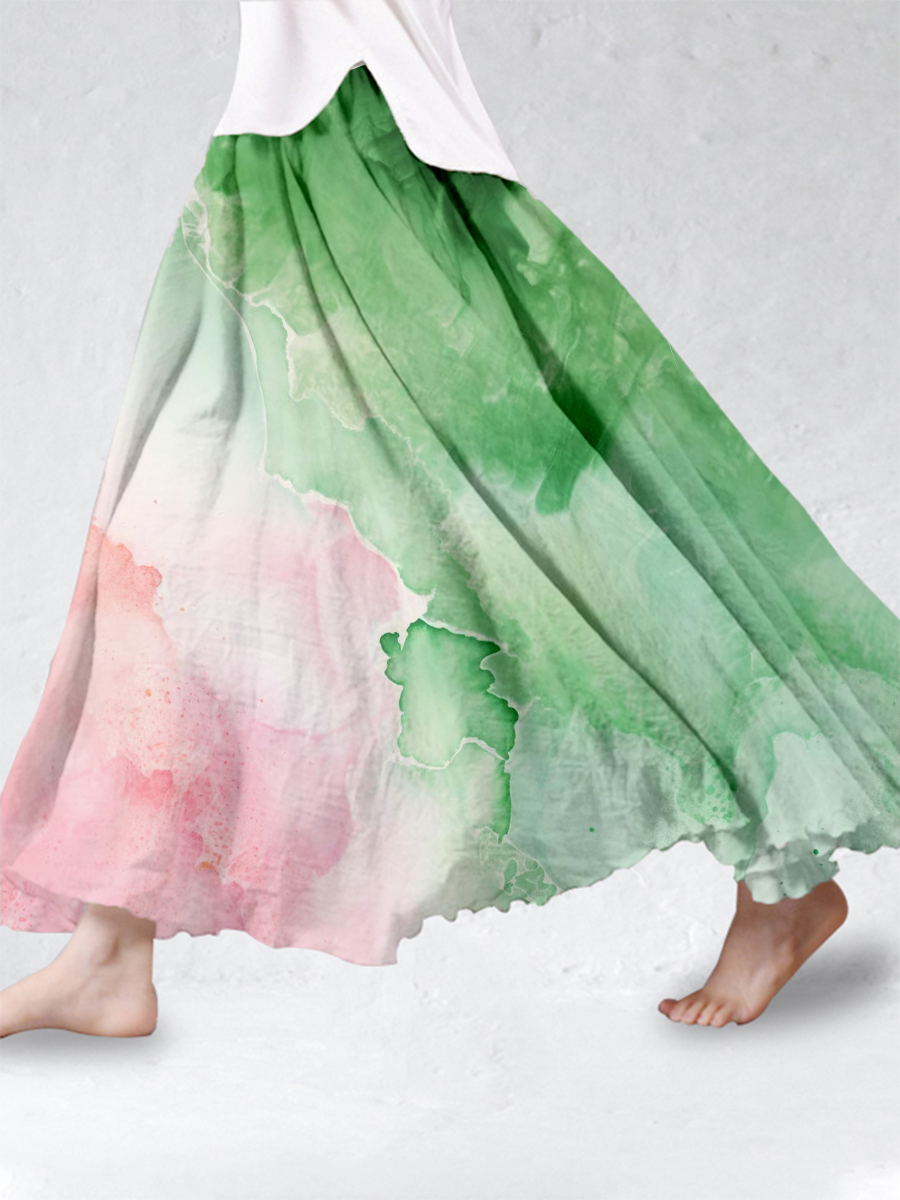 Womens Green And Pink Ink Painting Art Linen Skirt