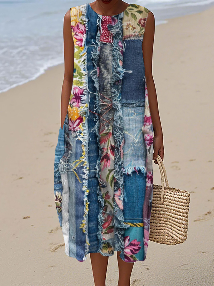 Women's Vintage Denim Patch Cotton Linen Casual Sleeveless Dress