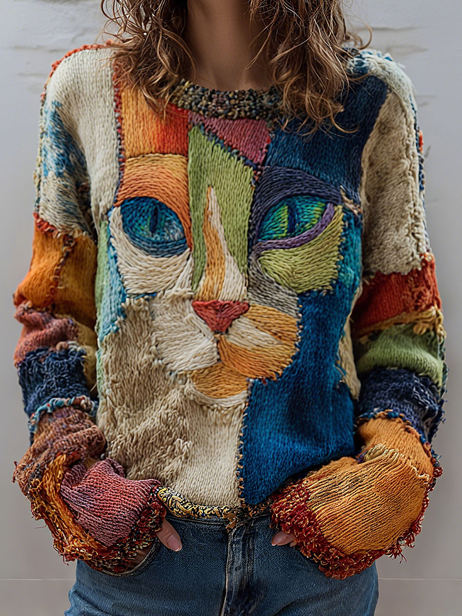 Women's Vintage Cat Art Print Art Casual Knitted Sweater