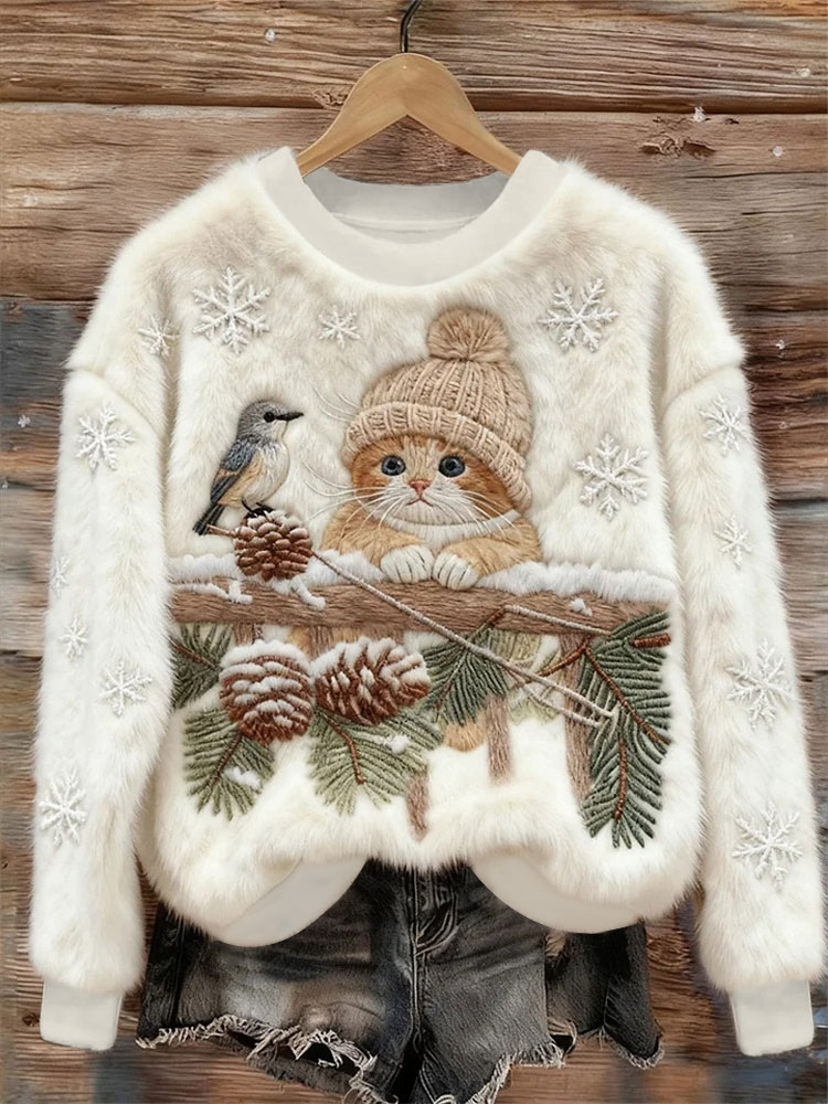 Women's Vintage Christmas Cat Printed Flannel Sweatshirt