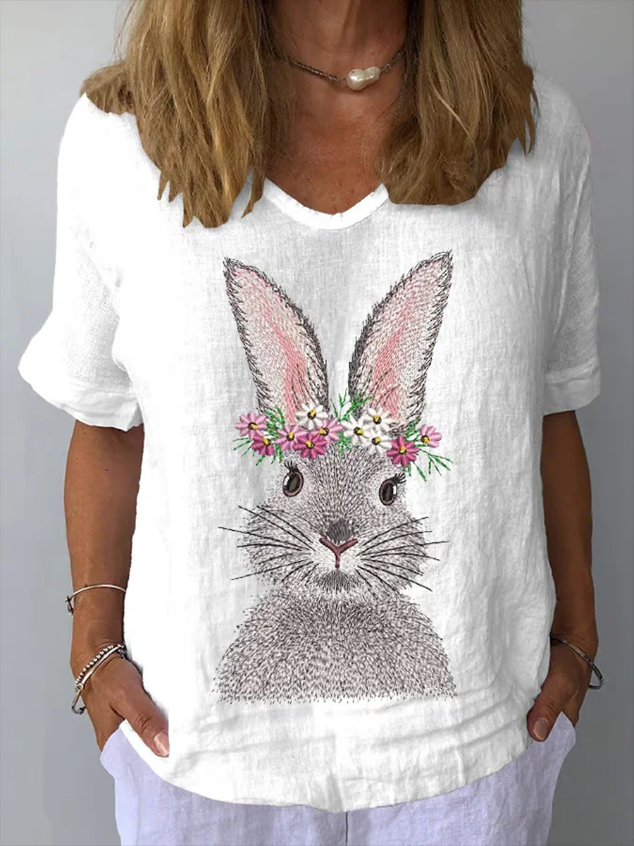 Women's Easter Bunny Print Casual V-Neck Cotton and Linen Top
