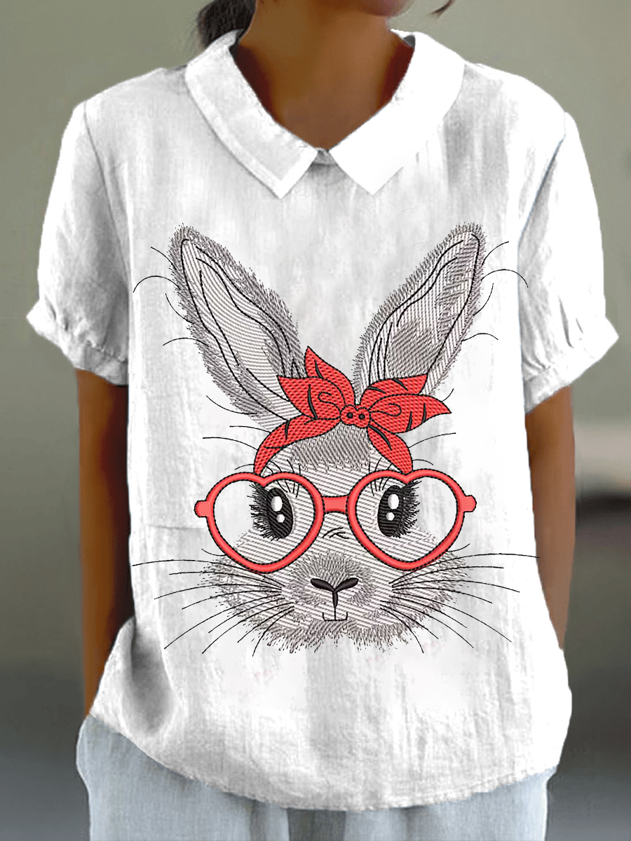 Women's Eatser Cute Bunny Pattern Printed Short Sleeve Cotton Linen Shirt