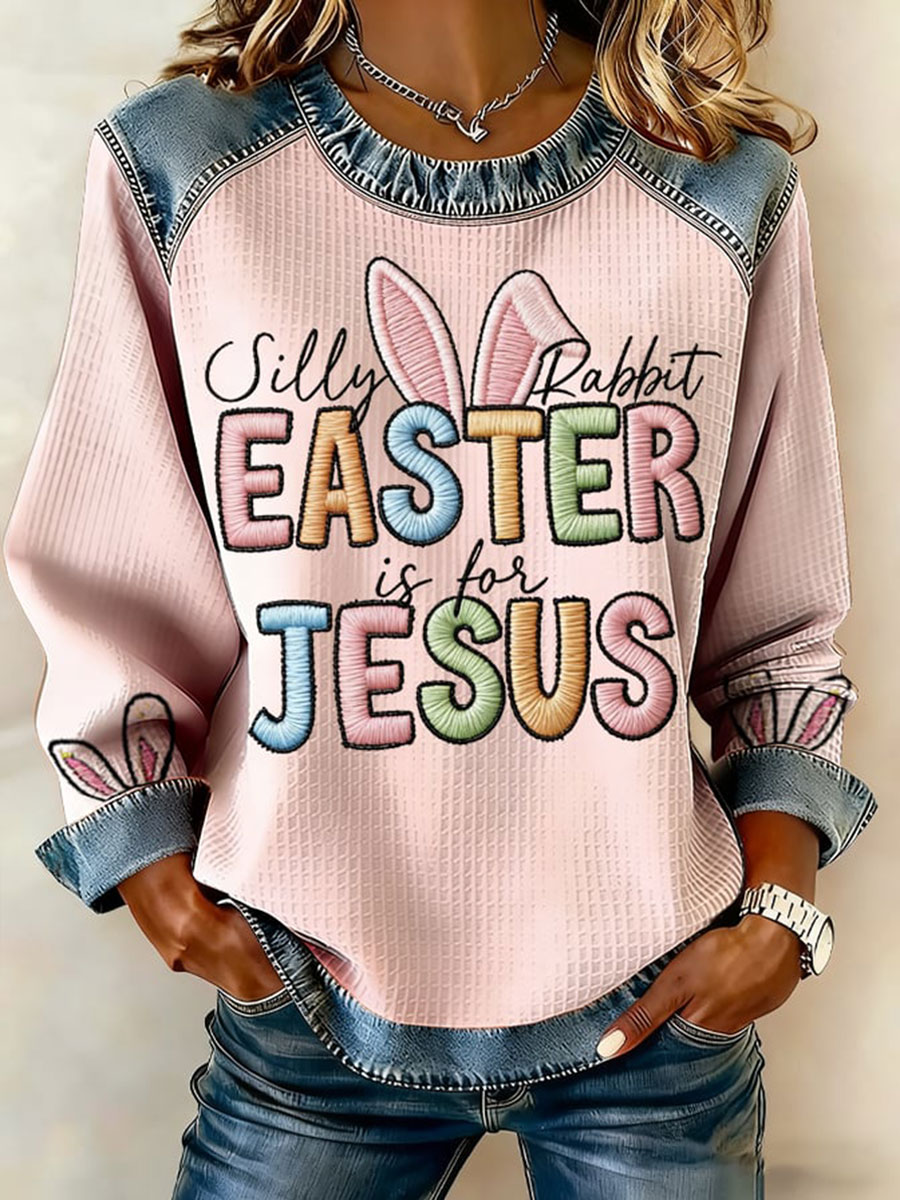 Women's Silly Rabbit Easter Is For Jesus Waffle Denim Patchwork Top