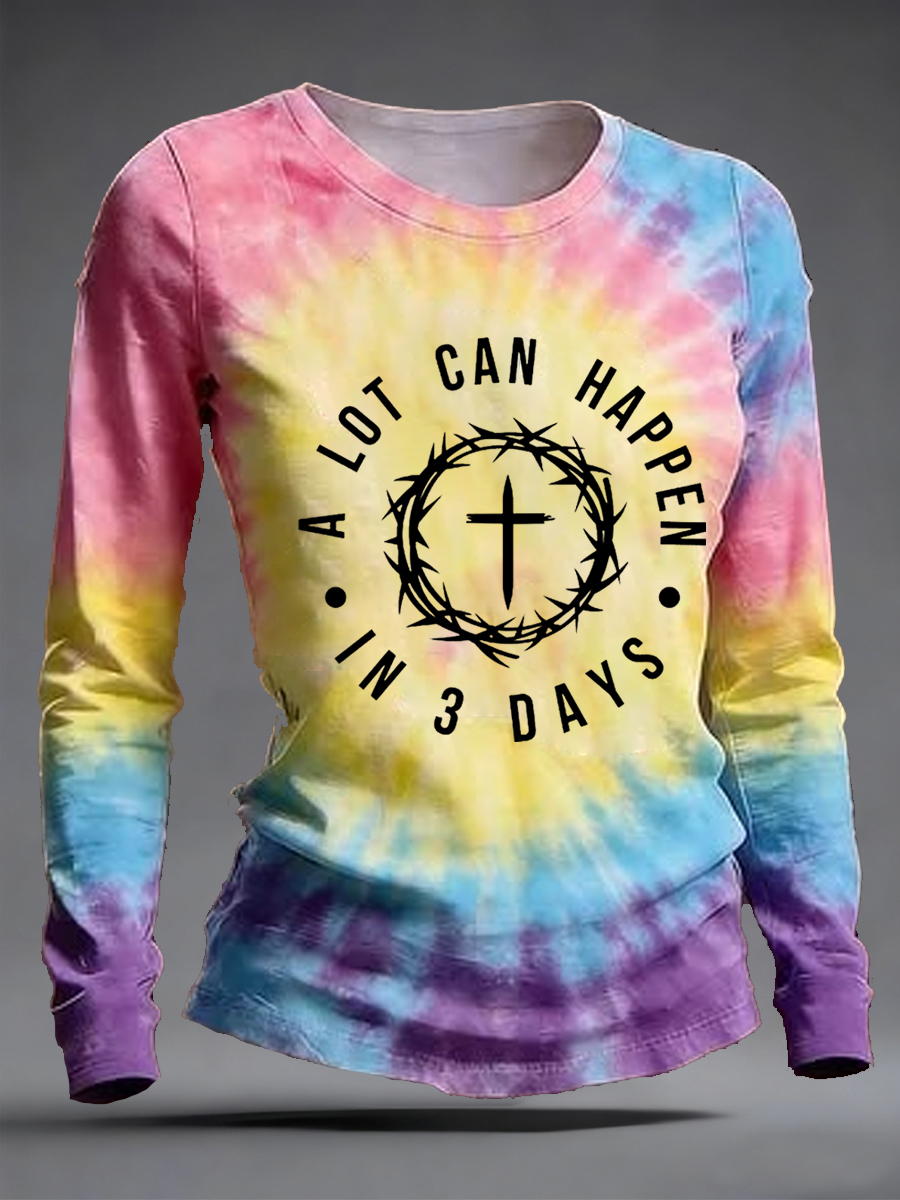 Women's A Lot Can Happen In 3 Days Christian Easter Tie-Dye Print Casual Long Sleeve T-shirt
