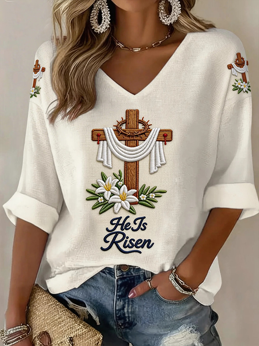 Women's He Is Risen Jesus Christian Cross Print Waffle V-Neck Top