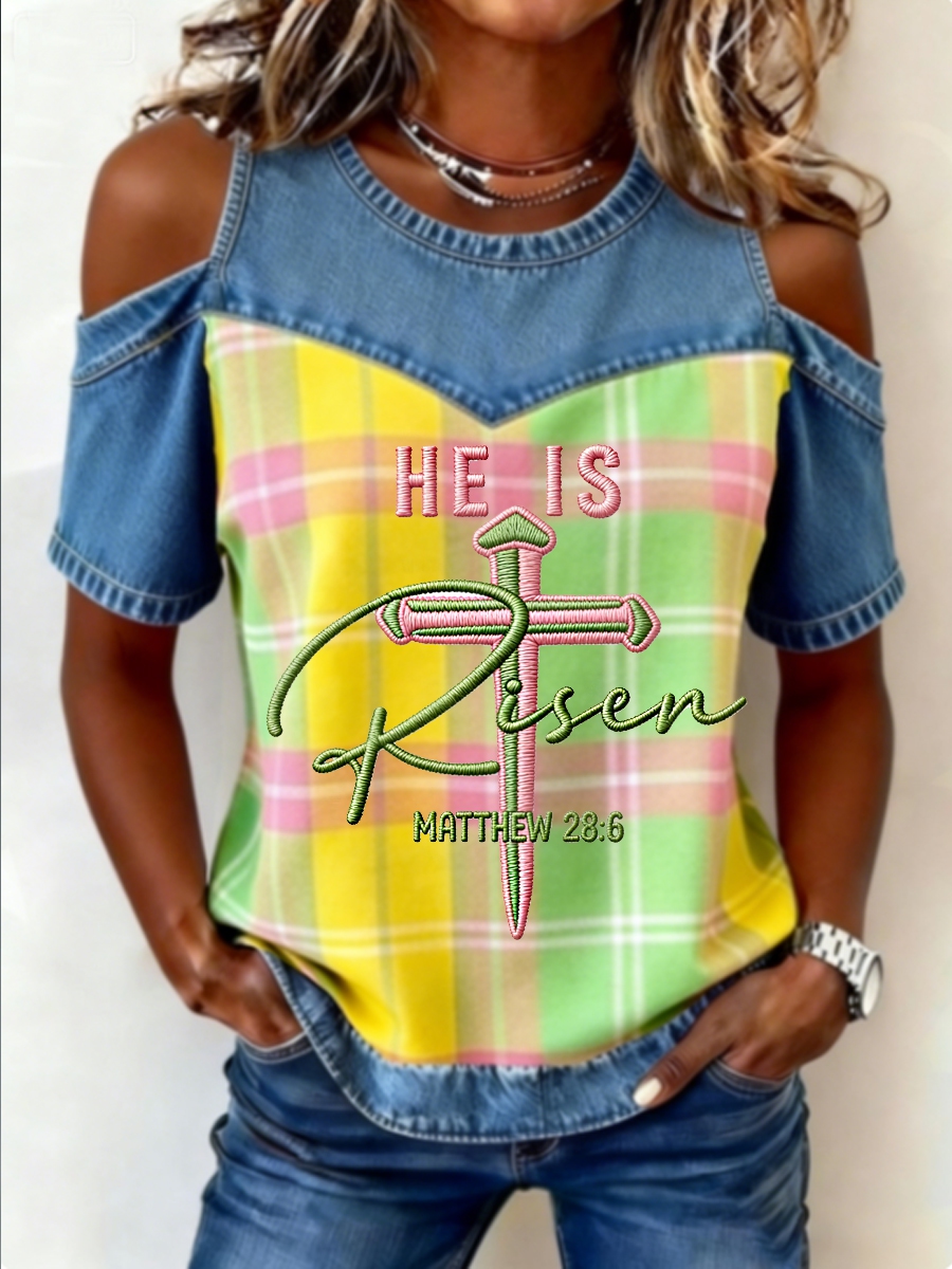 Women's He is Riser MATTHEW 28:6 Denim Patchwork Top