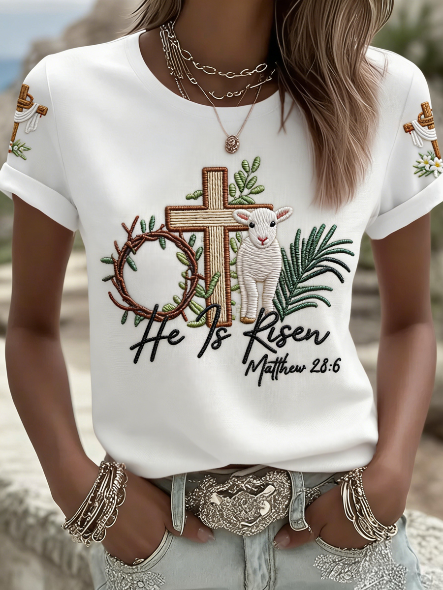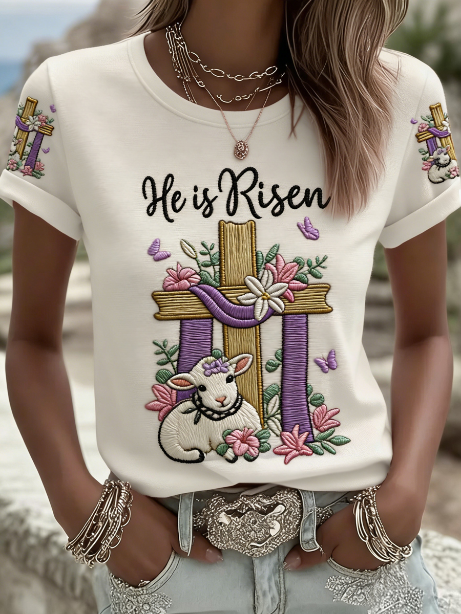 Women's He Is Risen Jesus Christian Cross Lamb Print Tee