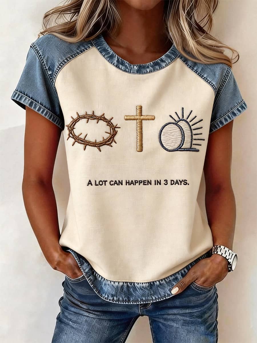 Women's A Lot Can Happen In 3 Days Embroidery Pattern Denim Patchwork Top
