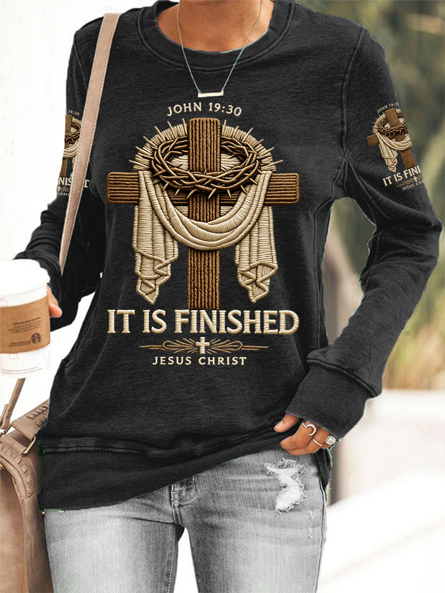 Women's He Is Risen It’s Finished Jesus Christian Cross Print Casual Sweatshirt