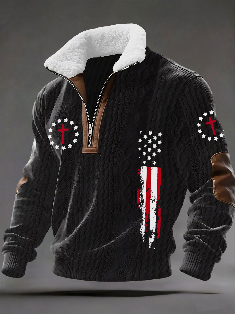 Men's Jesus Loves You Cross Faith USA Flag Print Casual Checkered Hoodie