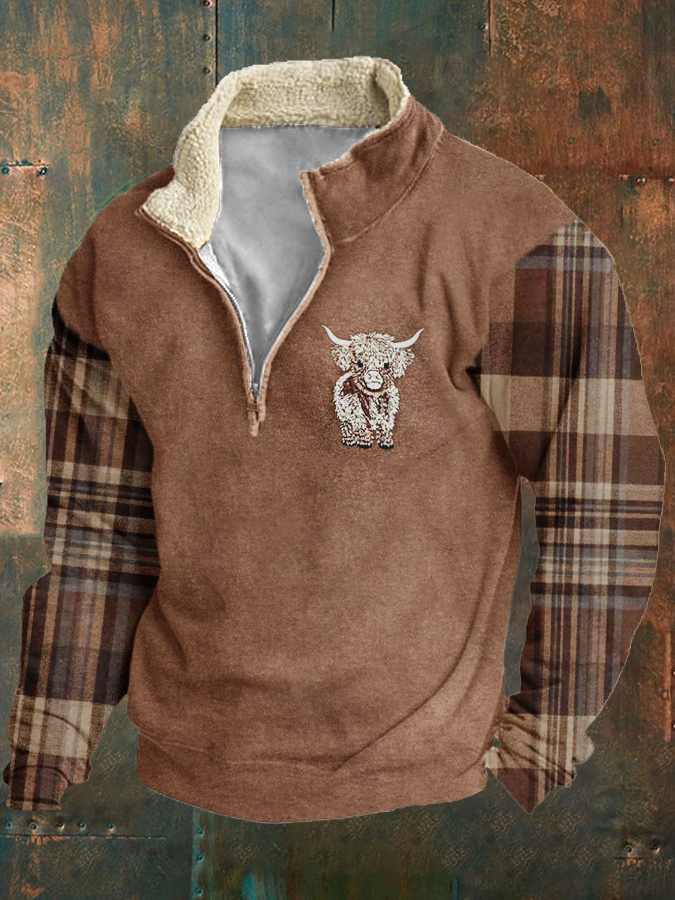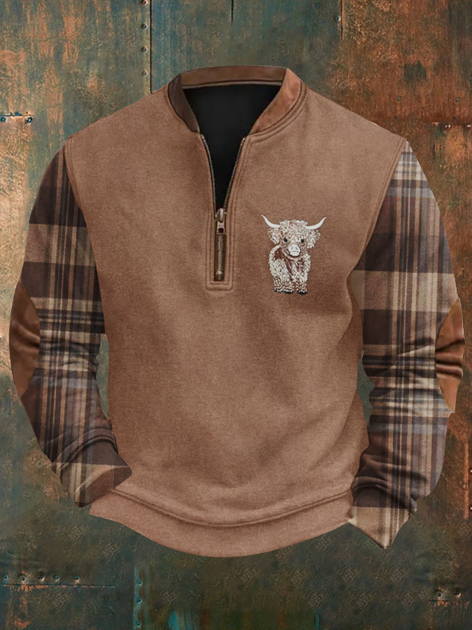 Men's Scottish Highland Cow Embroidery Plaid Long Sleeve Sweatshirt