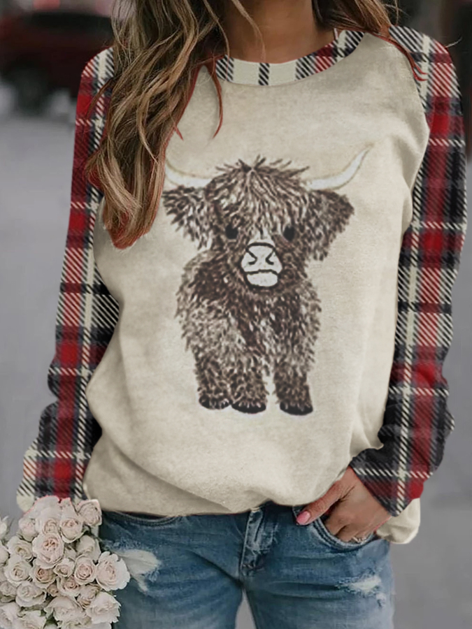 Women's Scottish Highland Cow Embroidery Plaid Long Sleeve Sweatshirt