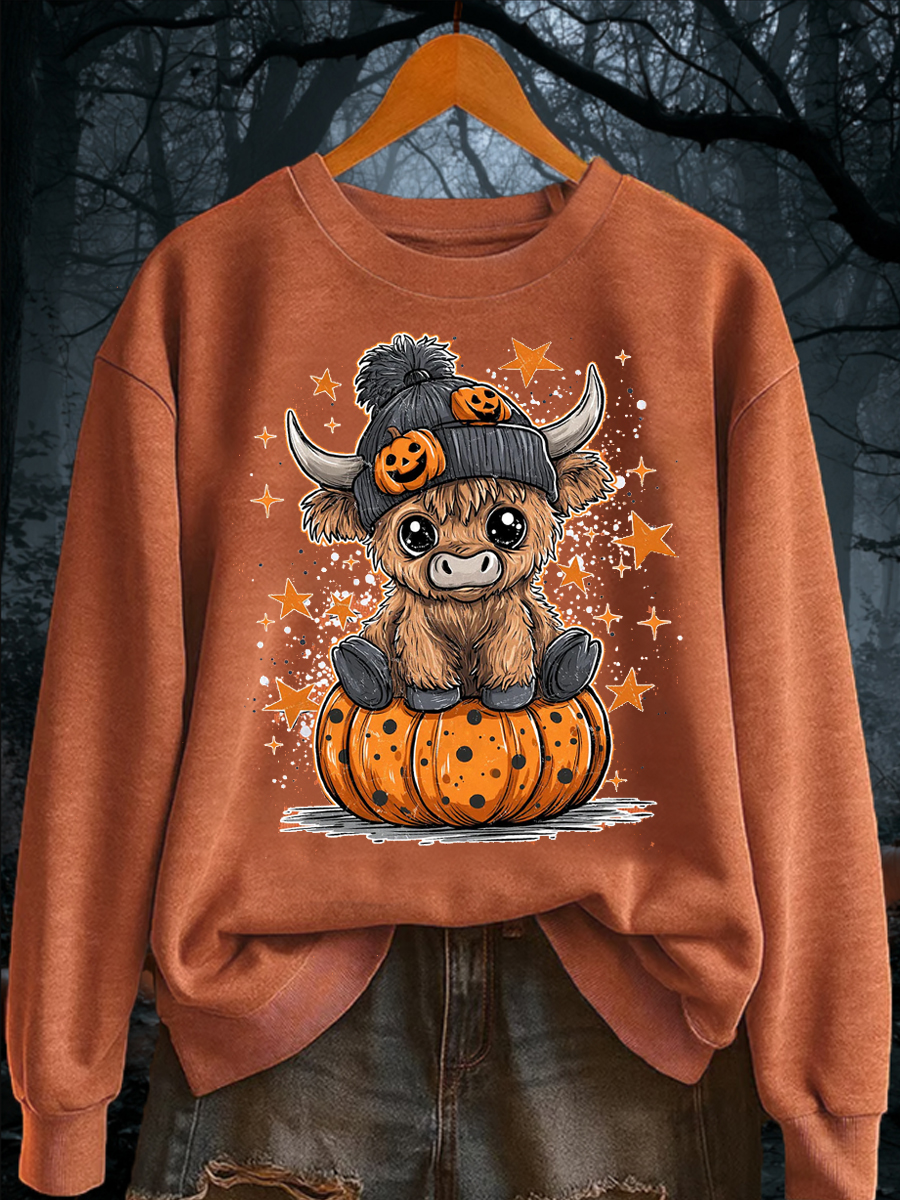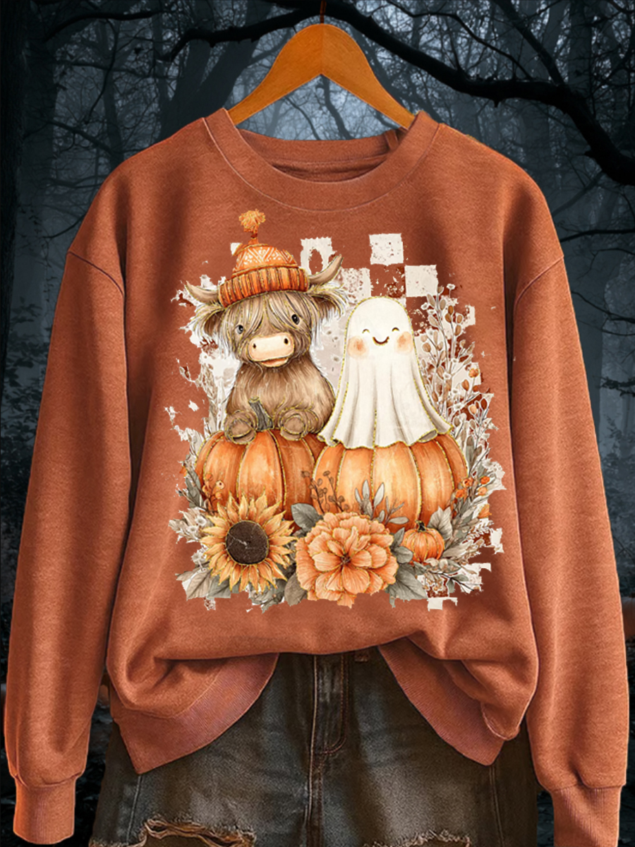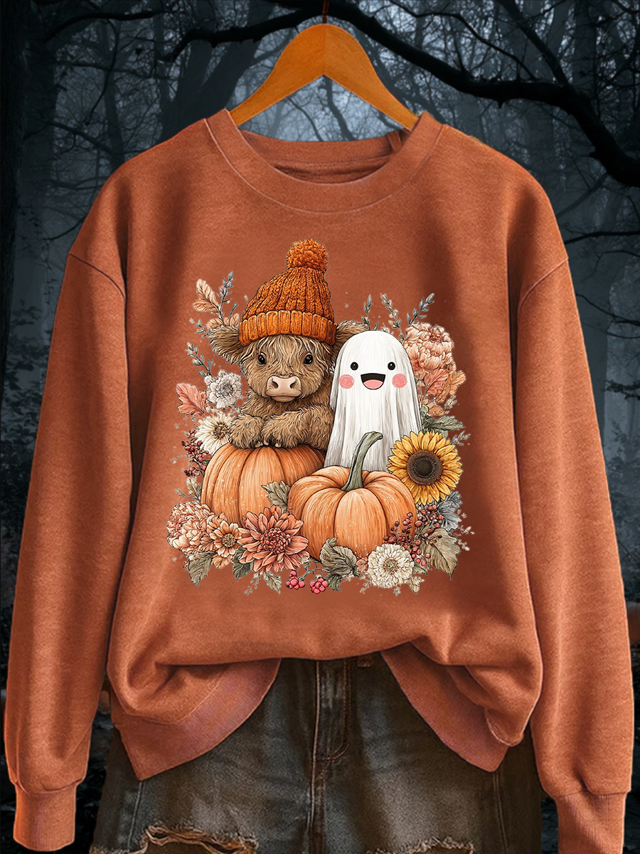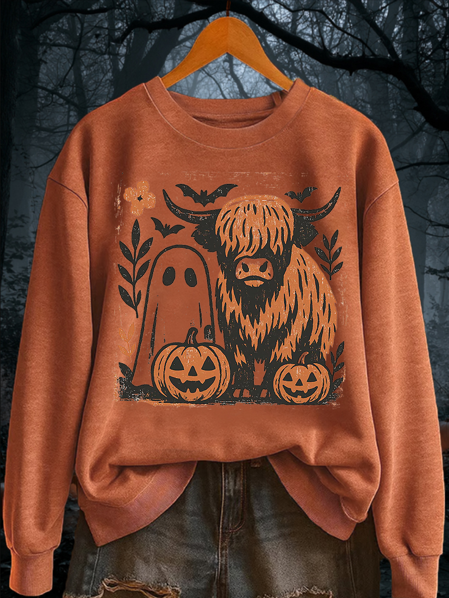 Women's Retro Cute Autumn Highland Cow Horror Ghost Halloween Pumpkin Hoodie