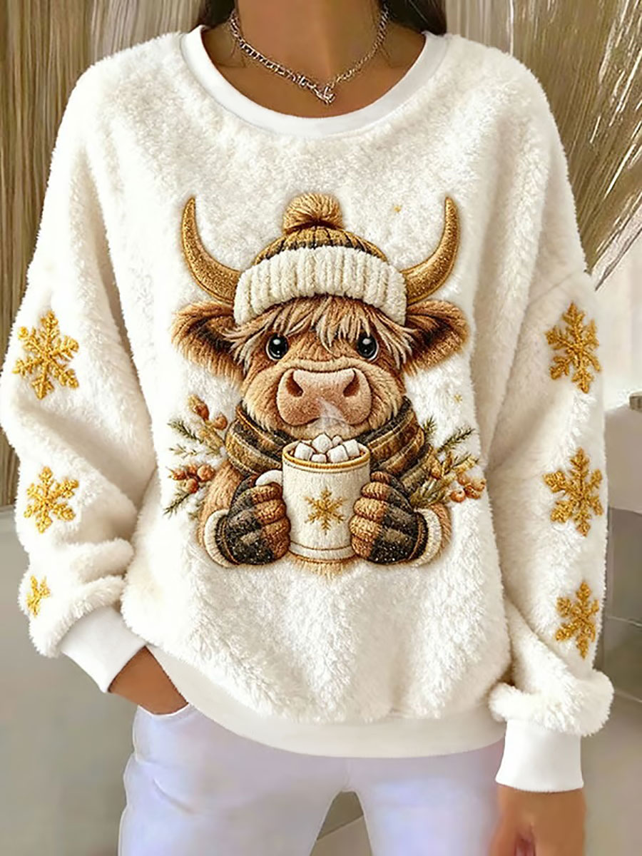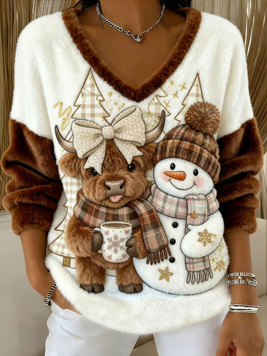 Women's Cute Highland Cow And Snowman Print Casual Flannel Sweatshirt