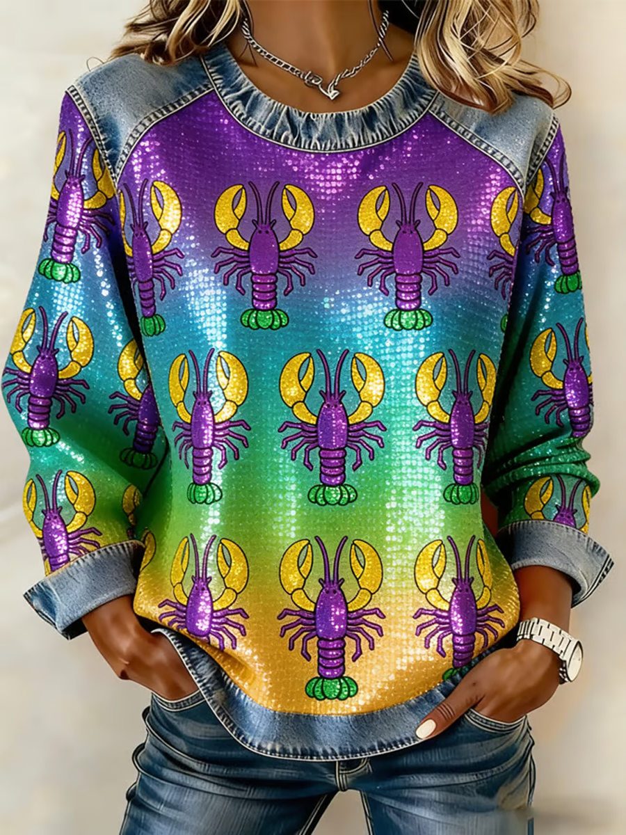Women's Mardi Gras Crawfish Print Round-Neck Sweatshirt