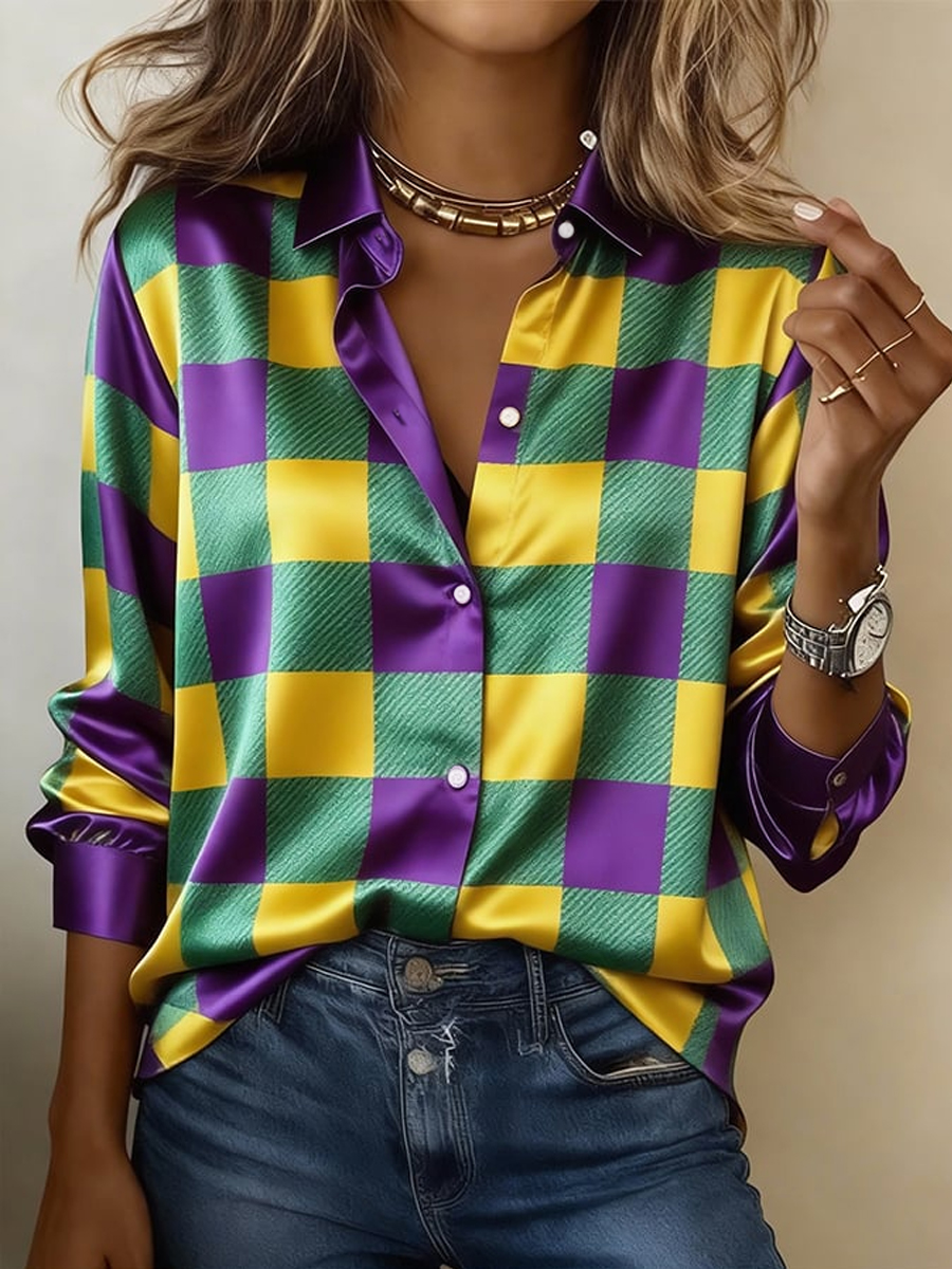 Women's Mardi Gras Plaid Print Casual Satin Shirt