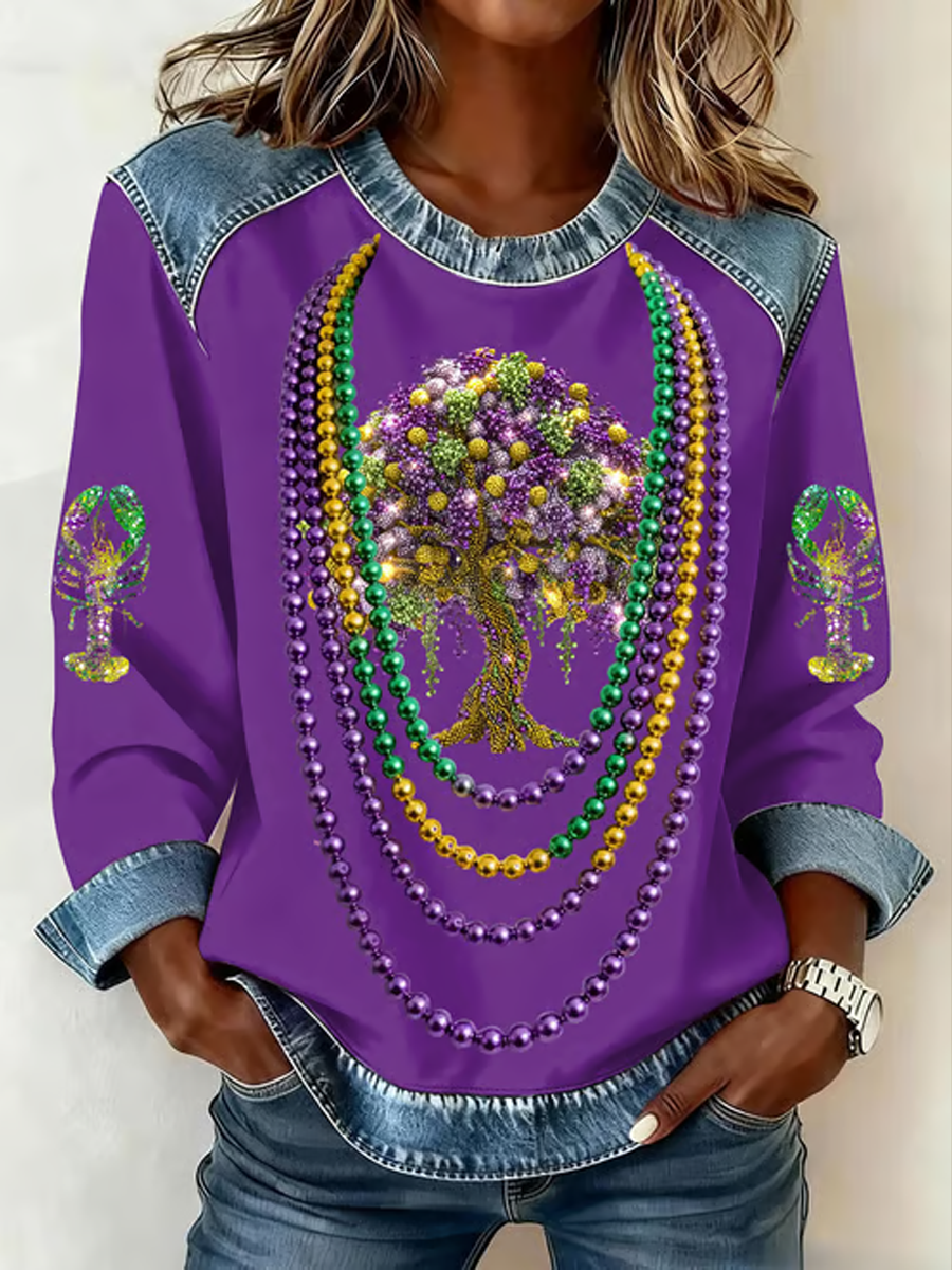 Women's Mardi Gras Sequin Print Denim Patchwork Top