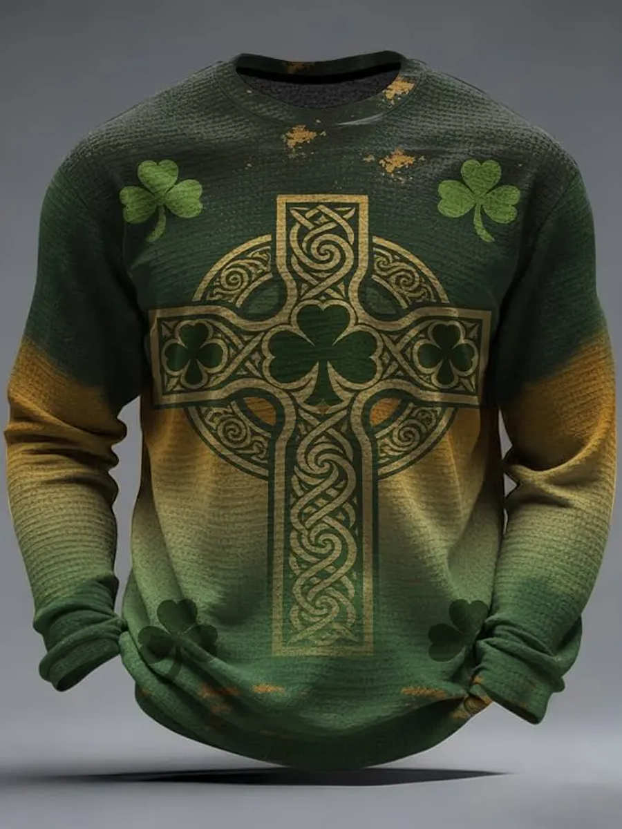 Men's Vintage St. Patrick's Day Shamrock Art Printed Waffle Long Sleeve T-Shirt