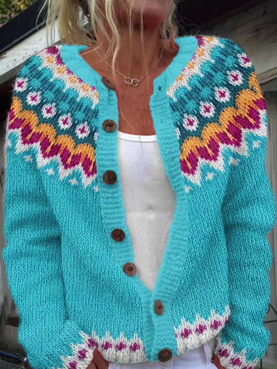 Women's Winter Icelandic Sweater Round Neck Loose Button Chunky Knit Cardigan Sweater
