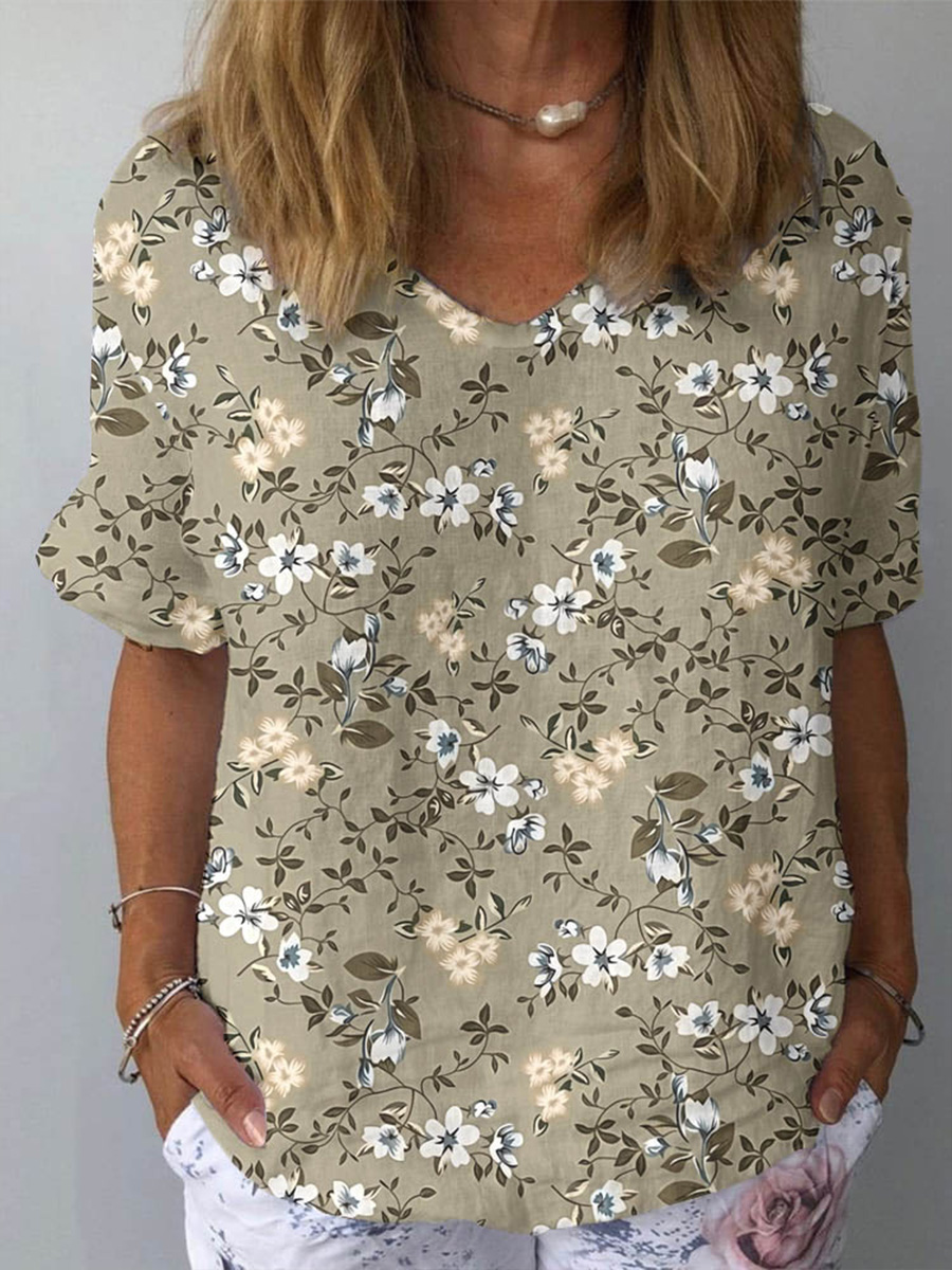 Women's Elegant Flower Print Casual V-Neck Cotton and Linen Top