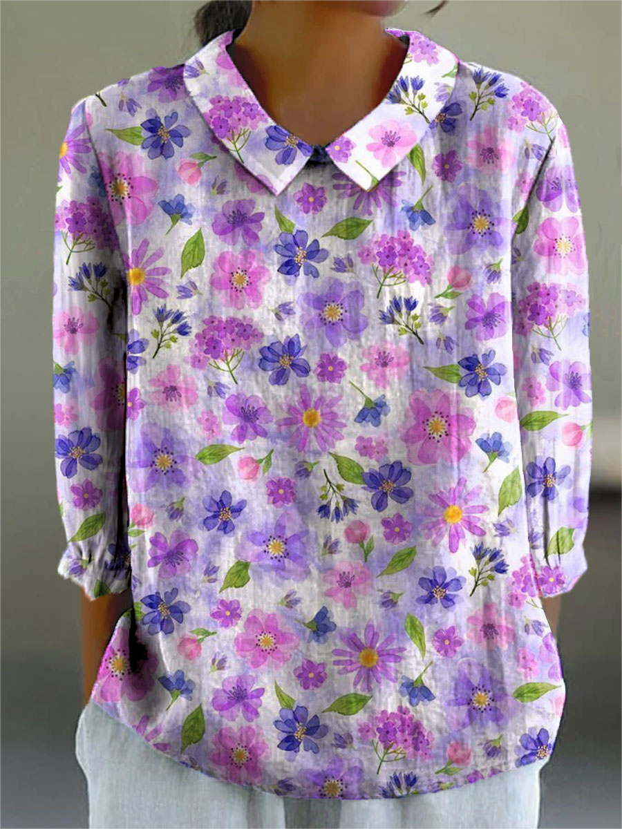 Women's Vintage Purple Art Print Casual Cotton Linen Ruffle Shirt
