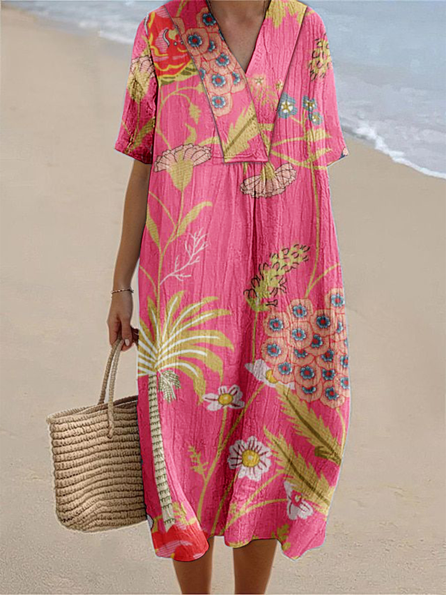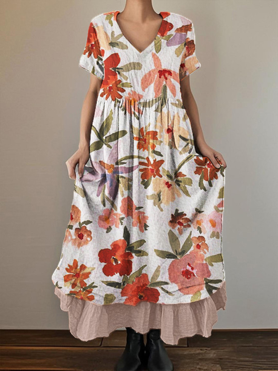 Women's Floral Art Print V-Neck Short Sleeve Cotton Linen Double Layer Dress